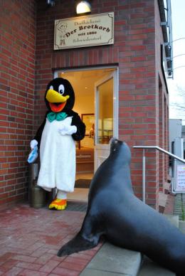 Unsere Seelöwen Paul und Mister Murdoch waren in ihrem Element, als vor drohendem Regenschauer, noch der NDR -Werbespot für die Übertragungen des Faschingumzuges in der Bäckerei "der Brotkorb" im beschaulichen Ort Schwiederstorf gedreht wurde.