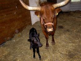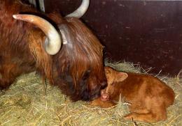 „Ashly" unsere Mix-Kuh stammt ab von einem Schottischen Hochlandrind und einem Watussi-Bullen. Auf der Weide schloss Ashly Freundschaft mit einem kleinen Dexter-Bullen. Heute früh präsentierte sie uns das Ergebnis dieser Liebe, ein süsses kleines Kalb! Die Geburt verlief problemlos, das Baby hat viel Durst und Mami Ashly zum Glück gaaanz viel Milch.