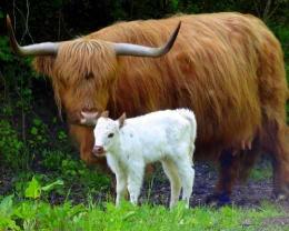 Claire, die Hochlandrinder-Oma hat am Vormittag auf der Weide ein weisses Kälbchen geboren. Die Schnute, die Ohren und Füsschen sind in braunem Farbton und so sieht das Kleine recht clownesk aus. Es ist kräftig und tobt bereits mit Mama, Tante Finjia und deren Kalb über die Wiese.