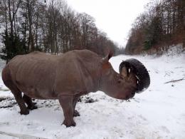 Zum Glück zeigte das Thermometer endlich wieder Plusgrade auf der Skala. Für Rafiki ist dies entscheidend, um die tolle Spielstunde im Schnee zu geniessen. Der Nashornbulle spielte übermütig mit seinen Reifen, versuchte sich als Schneeschieber und galoppierte durch sein über 6000m² grosses Gehege, bevor er mit grossem Appetit wieder in seinen gut beheizten, gemütlich warmen Stall zurückkehrte.