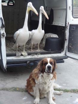"Wie lange dauert es noch, bis wir endlich abfahren?" fragen die Pelikane Werner und Toni und unser Bernhardinerhund Jacky