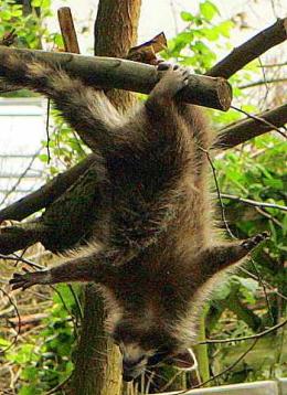Nachdem die letzten, mit Blitz und Donner durchwirkten Nächte und die sintflutartigen Wassermassen das Spiel der nachtaktiven Waschbären verdorben hatten, toben die lieben Tierchen sich jetzt wieder richtig aus. Wer ein echtes Filmtier werden will muss halt auch fleissig üben. So bereitet sich Filmtier Karlchen am Trapez vor, falls der Regisseur eine artistische Einlage wünscht.
